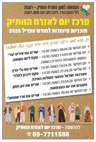 אנו שמחים להציע לך לקחת חלק בפעילות המתקיימת במרכז יום לאזרח הוותיק, ברעננה.